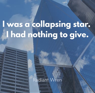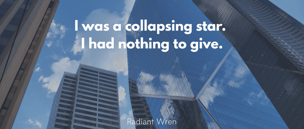 I was in no state to rally my team and get us focused for the year ahead. I wanted to, but my reaction to that meeting with my manager showed I could not. I was a collapsing star. I had nothing to give. The idea of trying to power through the pain and get to work sent me spiraling.